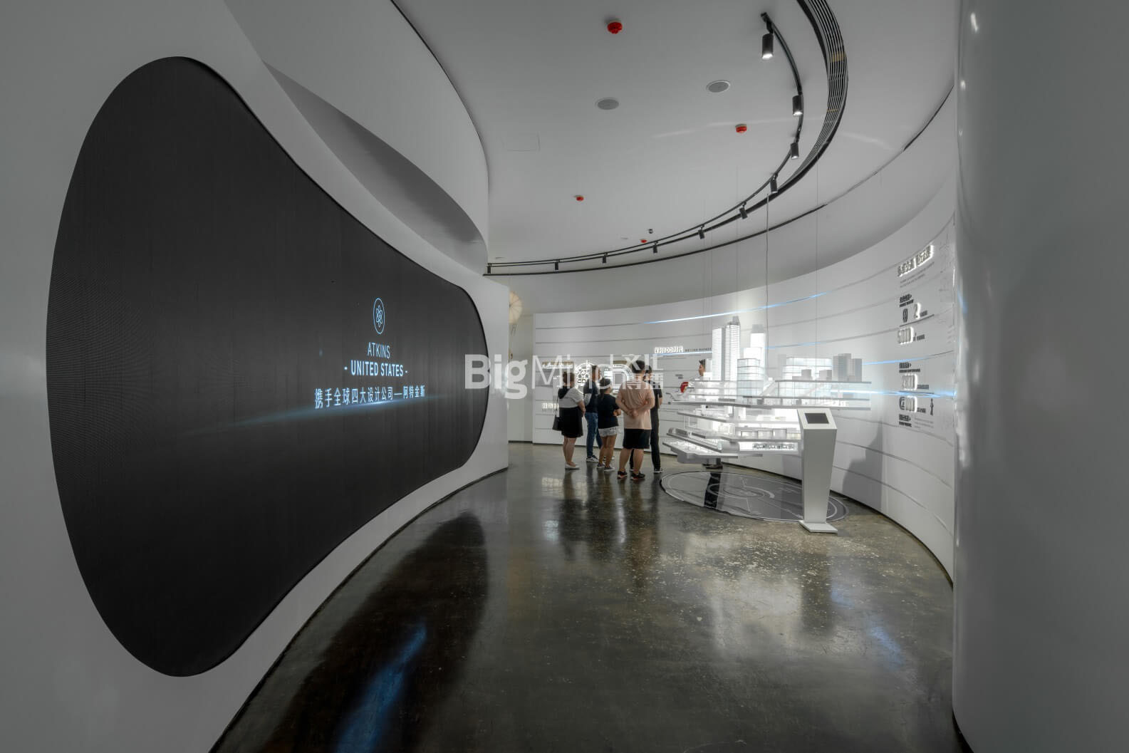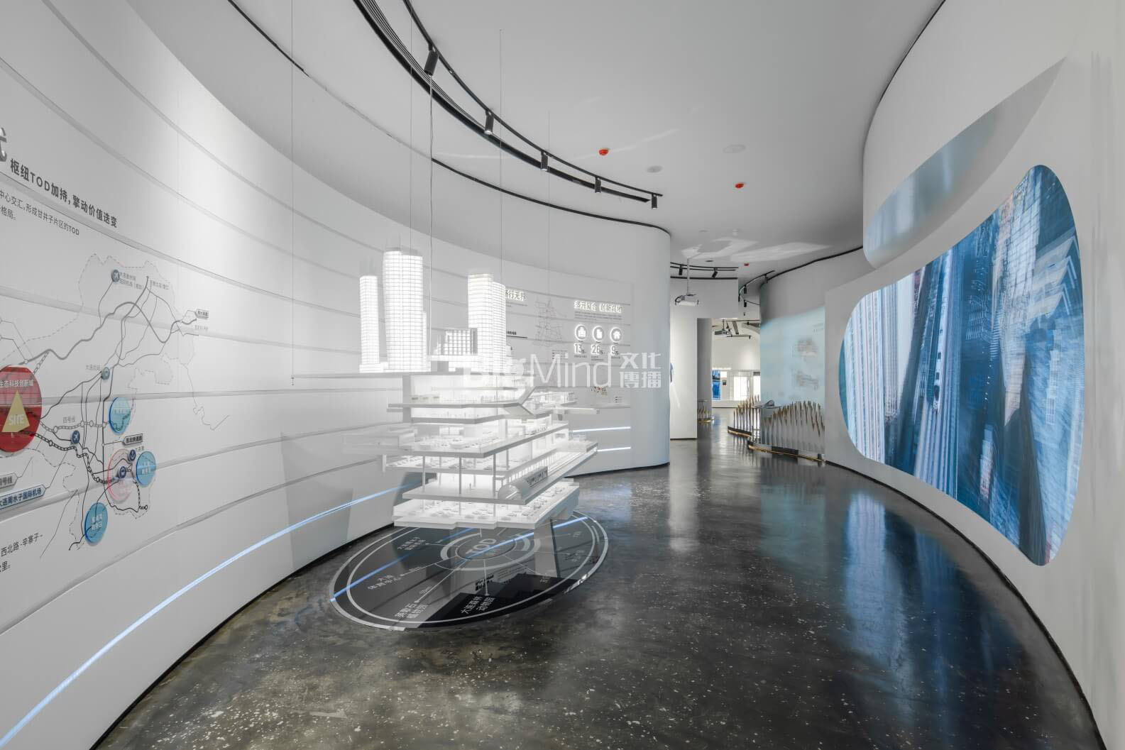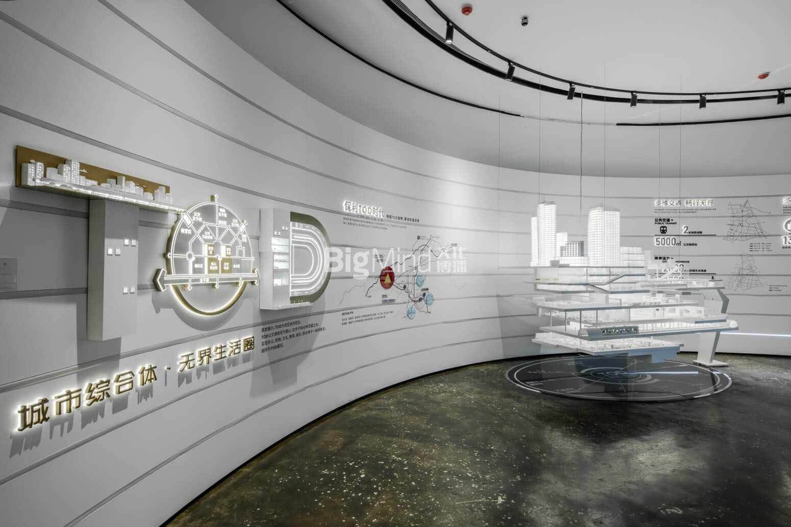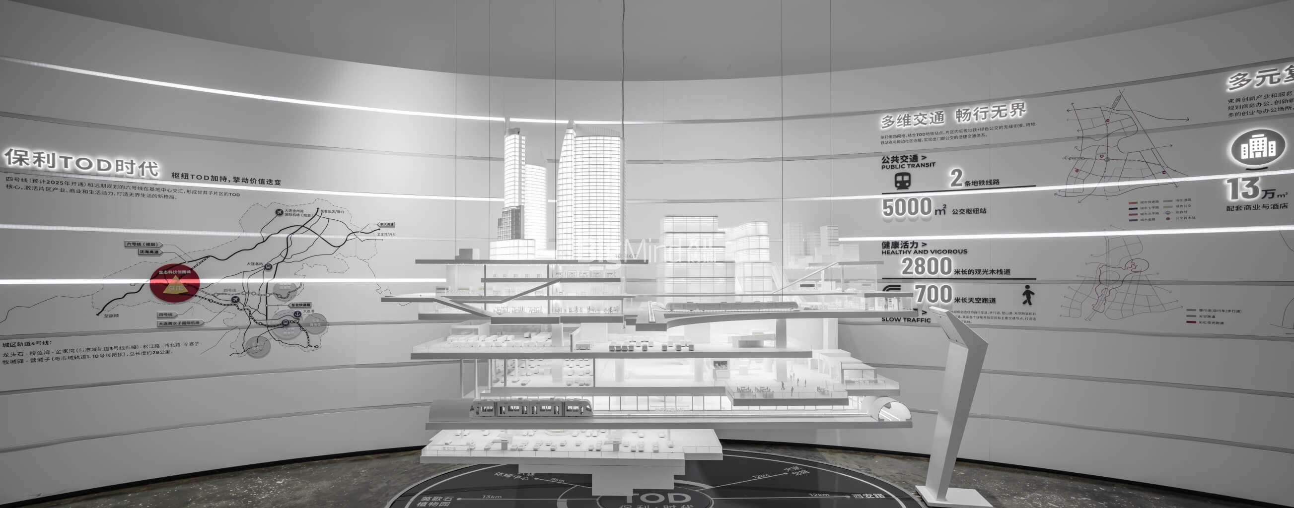 紧接着是素净的多维交通立体吊装模型更直观地解构和阐释TOD所创造的活力城市。通过异形的艺术影音区,体验衍生的无界生活,传达梦想之城的项目价值点。