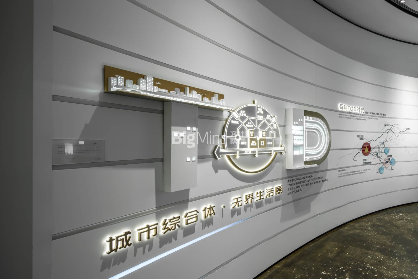 形象墙面采用TOD字母的灯箱细节展示城市综合体和无界生活圈,让人快速了解这是以公共交通为导向的综合发展国际化的新型模式,既优化城市空间形态又能提升城市形象。TOD枢纽综合体将是未来人居的首选方向。