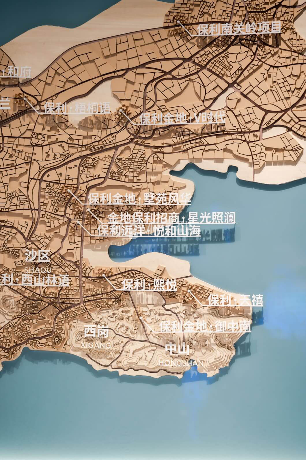 品牌的迎面选用满墙巨幅面积做成地图来展示保利在大连的众多项目,感官极为震撼