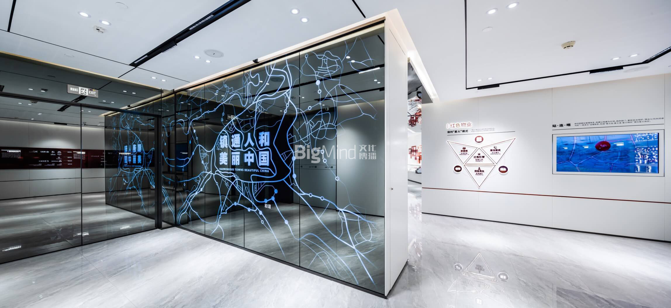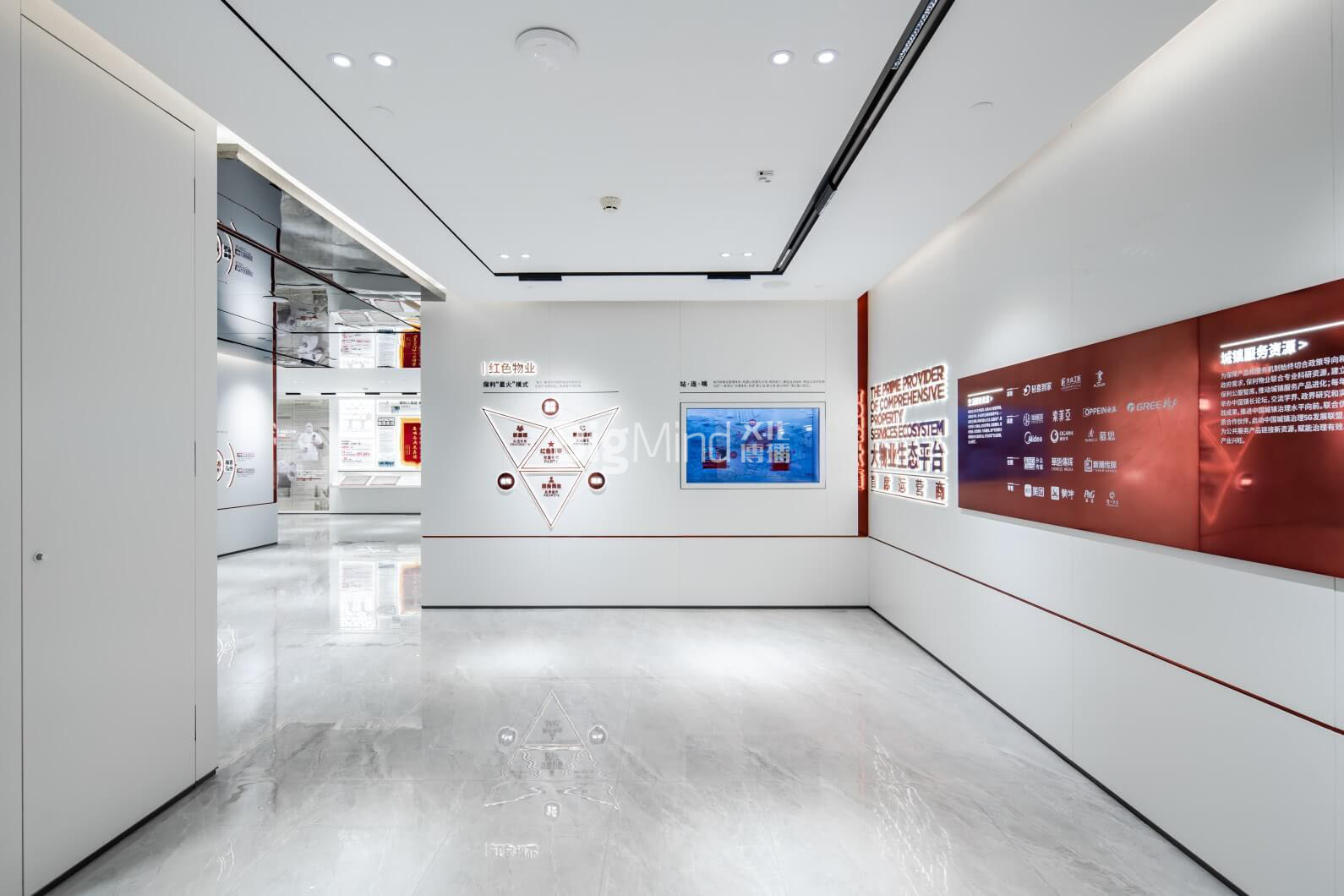 保利物业城市服务馆整体采用线性的艺术切割,交错组合出丰富的空间模块,并以中国红的简约色调贯穿其间,正如我们以国家力量所赋能的百城千镇,散落是点点星光,汇聚则是磅礴力量。