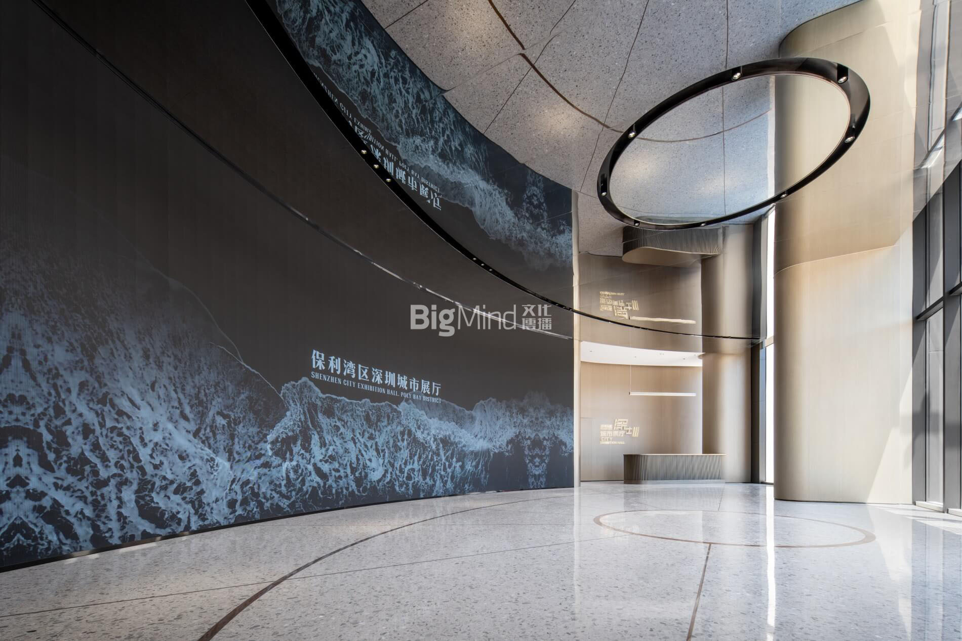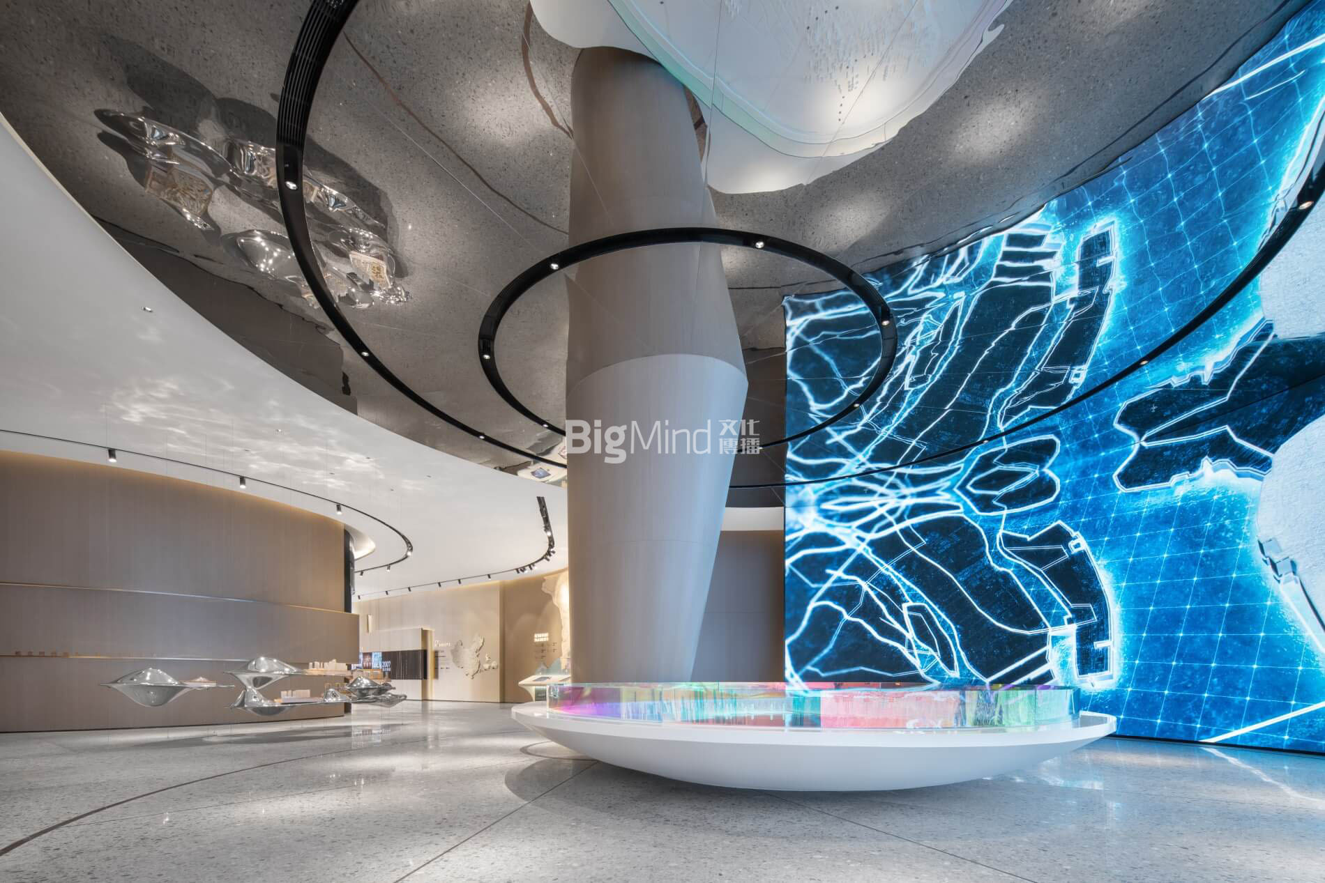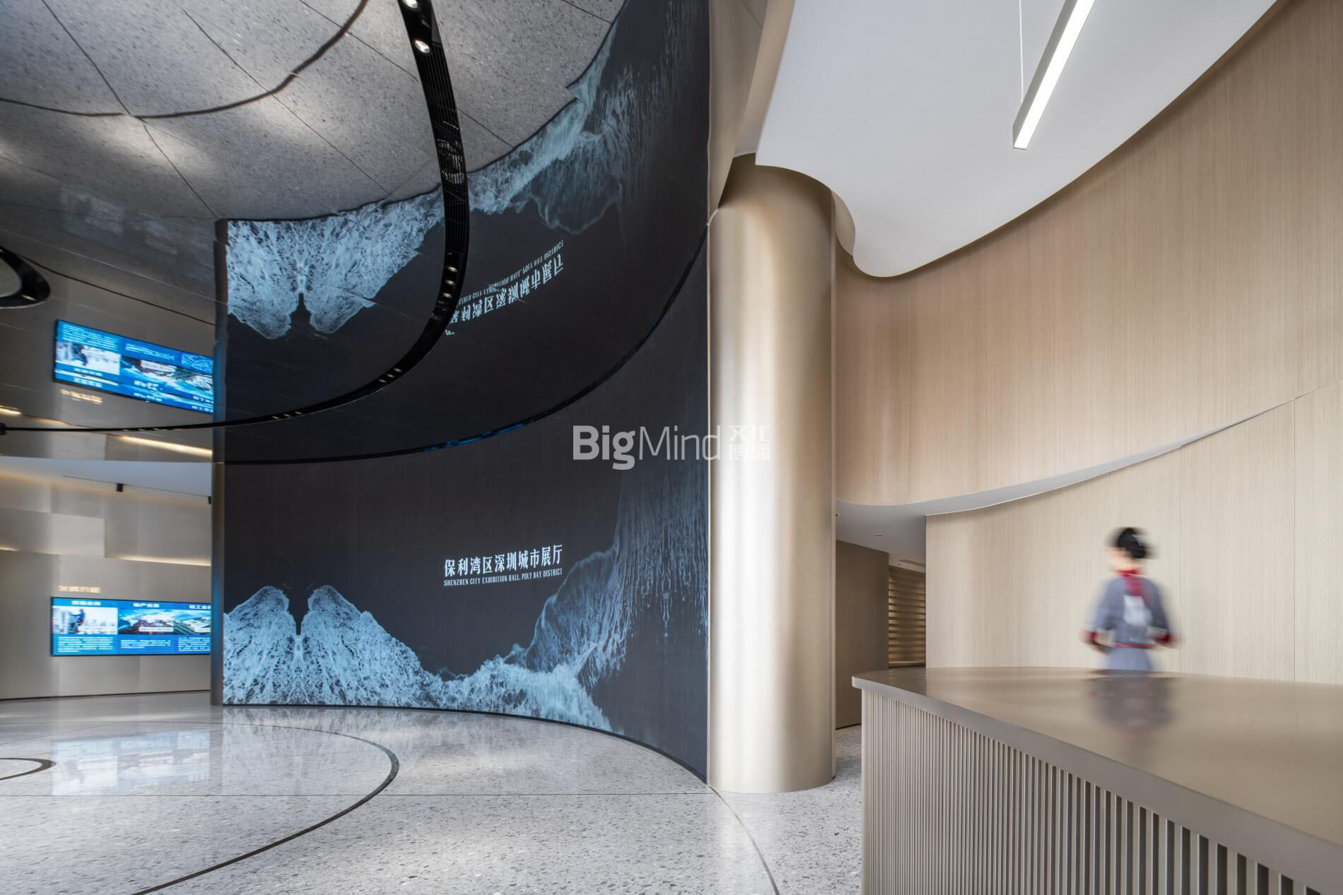 展厅地块为一个不规则Z型,展示空间主体由一个开放的半圆与一个围合的小圆构成。整体空间氛围、架构和局部细节,均以流动的浪潮形态贯彻。作为空间的统一元素,“浪”有两层隐喻,一指向其在地性,众所周知,深圳是中国南部海滨城市,二指向其时代性,自八十年代至今,深圳一直站在时代的潮头浪尖。