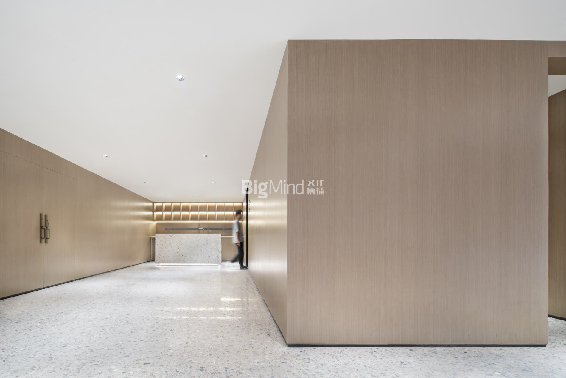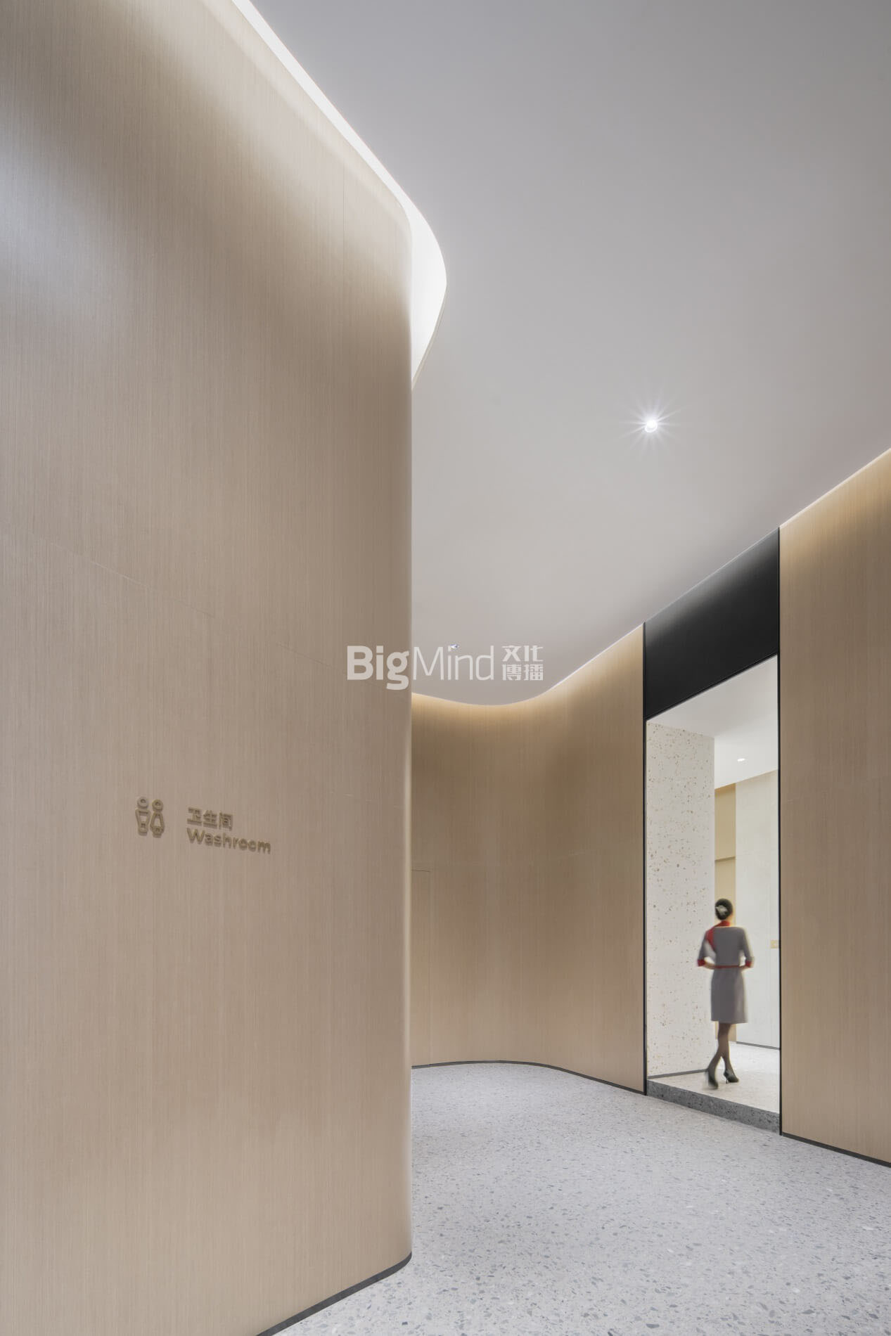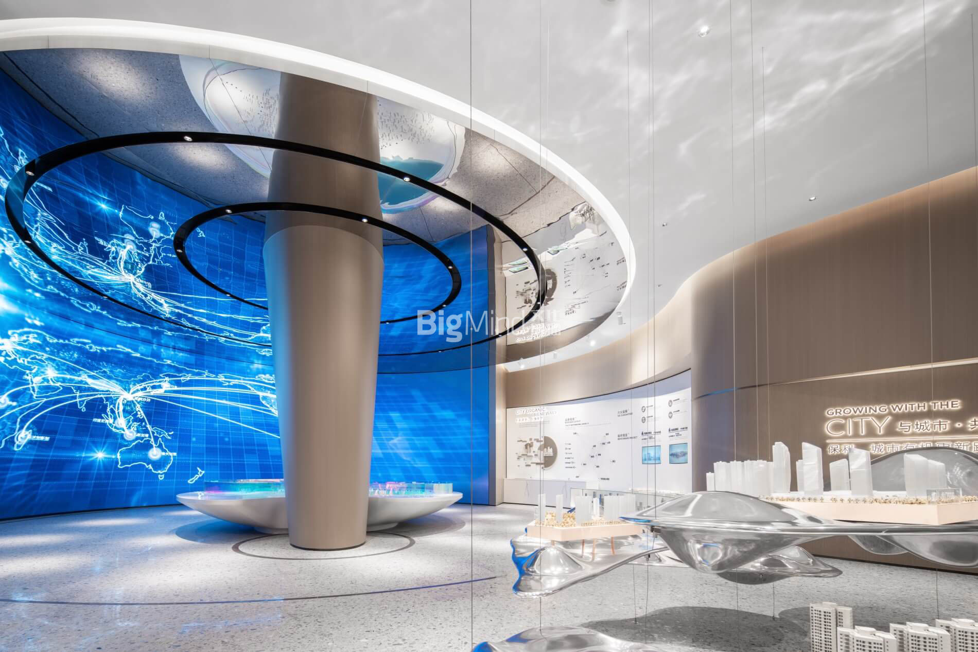 展厅地块为一个不规则Z型,展示空间主体由一个开放的半圆与一个围合的小圆构成。整体空间氛围、架构和局部细节,均以流动的浪潮形态贯彻。作为空间的统一元素,“浪”有两层隐喻,一指向其在地性,众所周知,深圳是中国南部海滨城市,二指向其时代性,自八十年代至今,深圳一直站在时代的潮头浪尖。