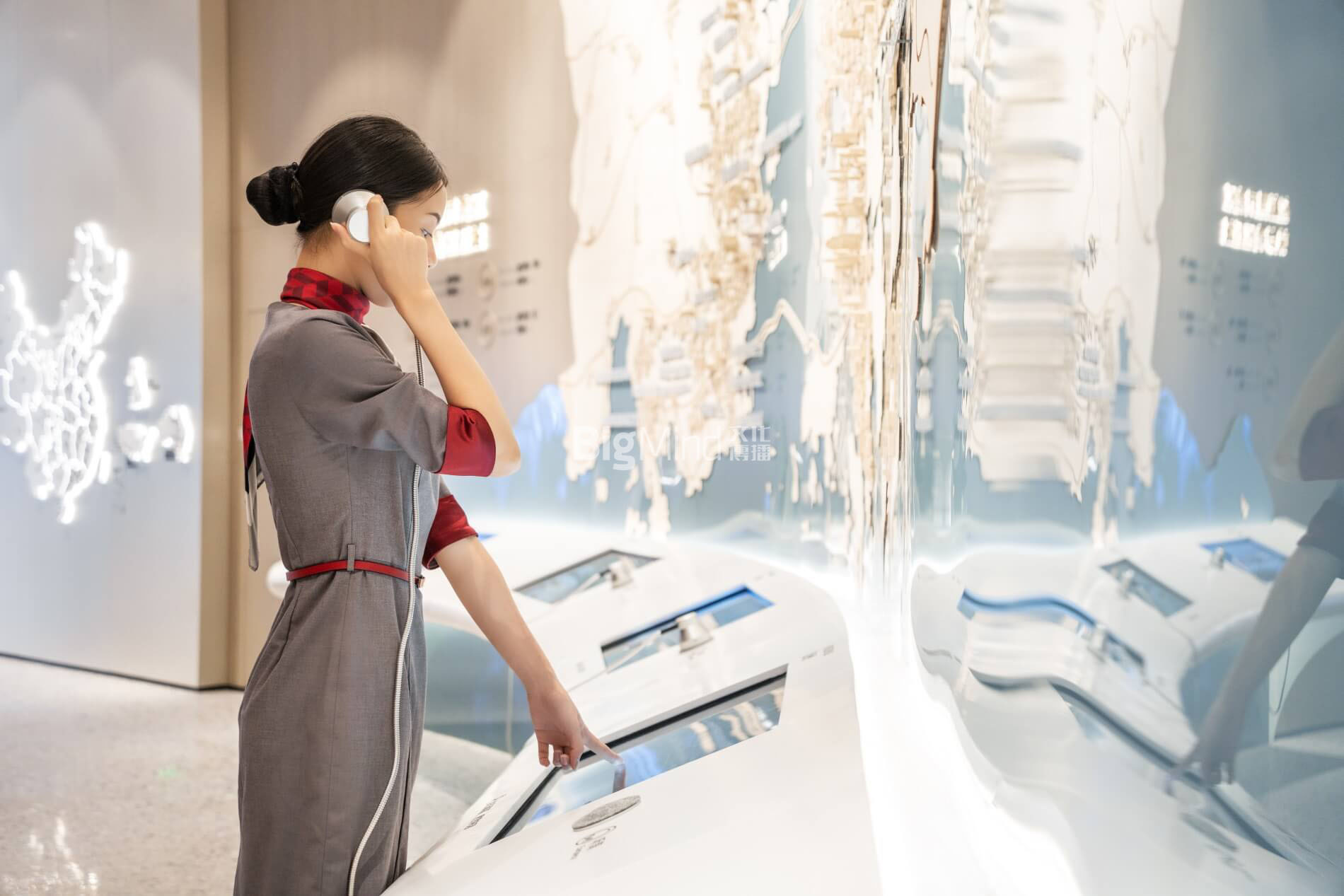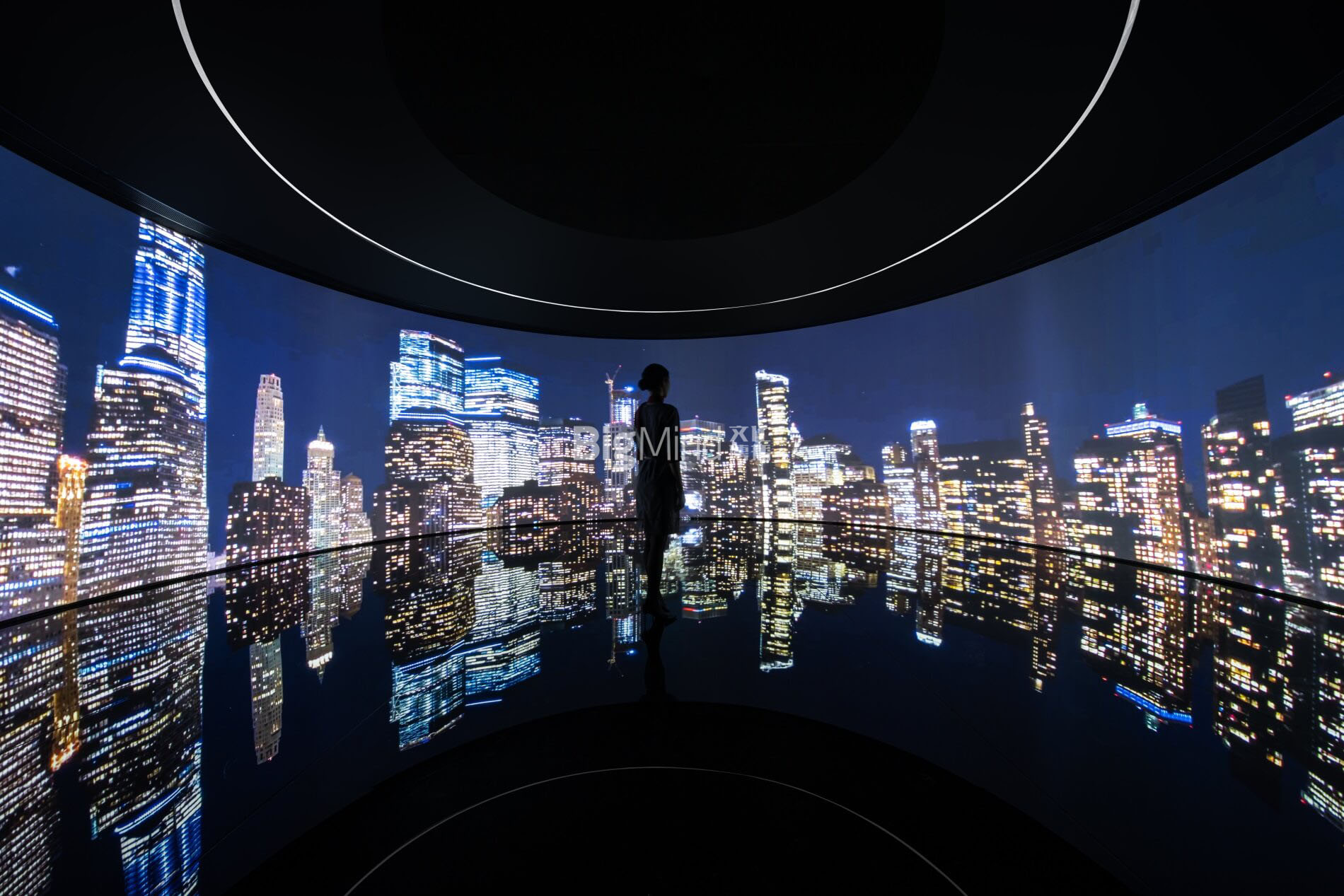 空间尺度并不在于建筑的真实尺寸,而是取决于现实尺寸与空间感觉的共同作用。人的行为活动受限于空间的构成,但思维可以独立在实体空间界限之外。信息技术所制造的影像突破了时间与空间的限定,无论是墙壁、天花或者地面都能被信息化的影像,如多媒体屏幕、投影装置所包围。设计师通过信息技术媒介,把城市信息实时引入展厅之内,不仅为观者带来生动的观展体验,也拓展了空间尺度。观者通过听筒和触摸屏,可以聆听和了解湾区城市信息,实现与湾区城市之声的直接对话。