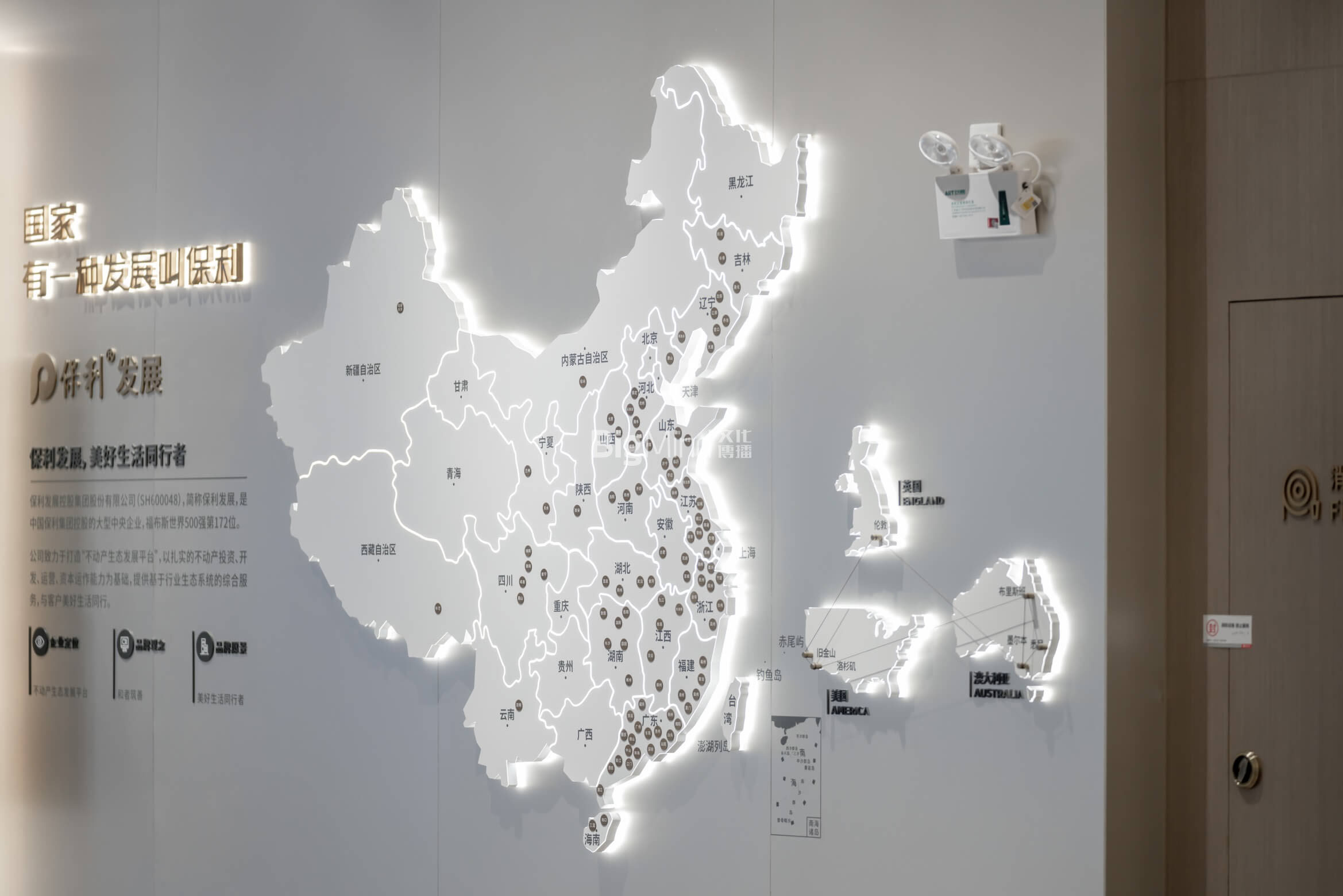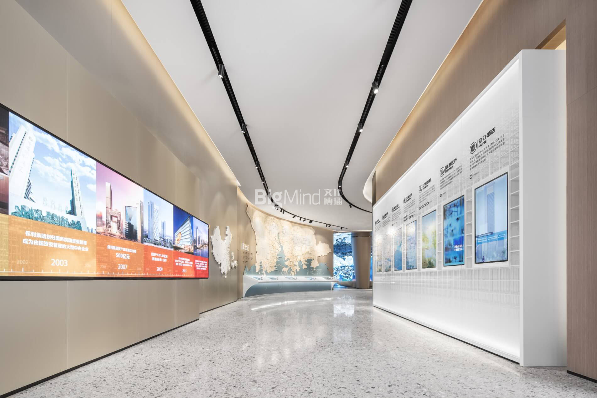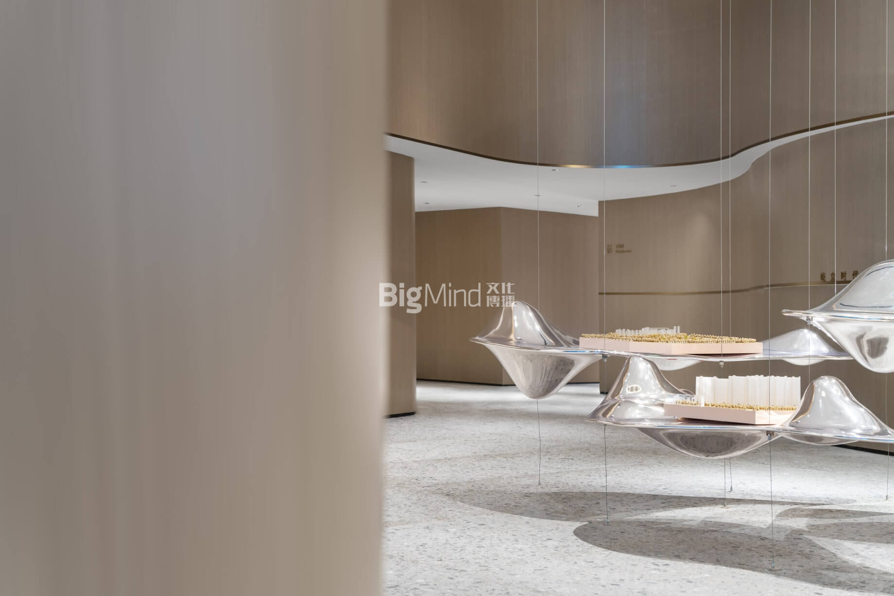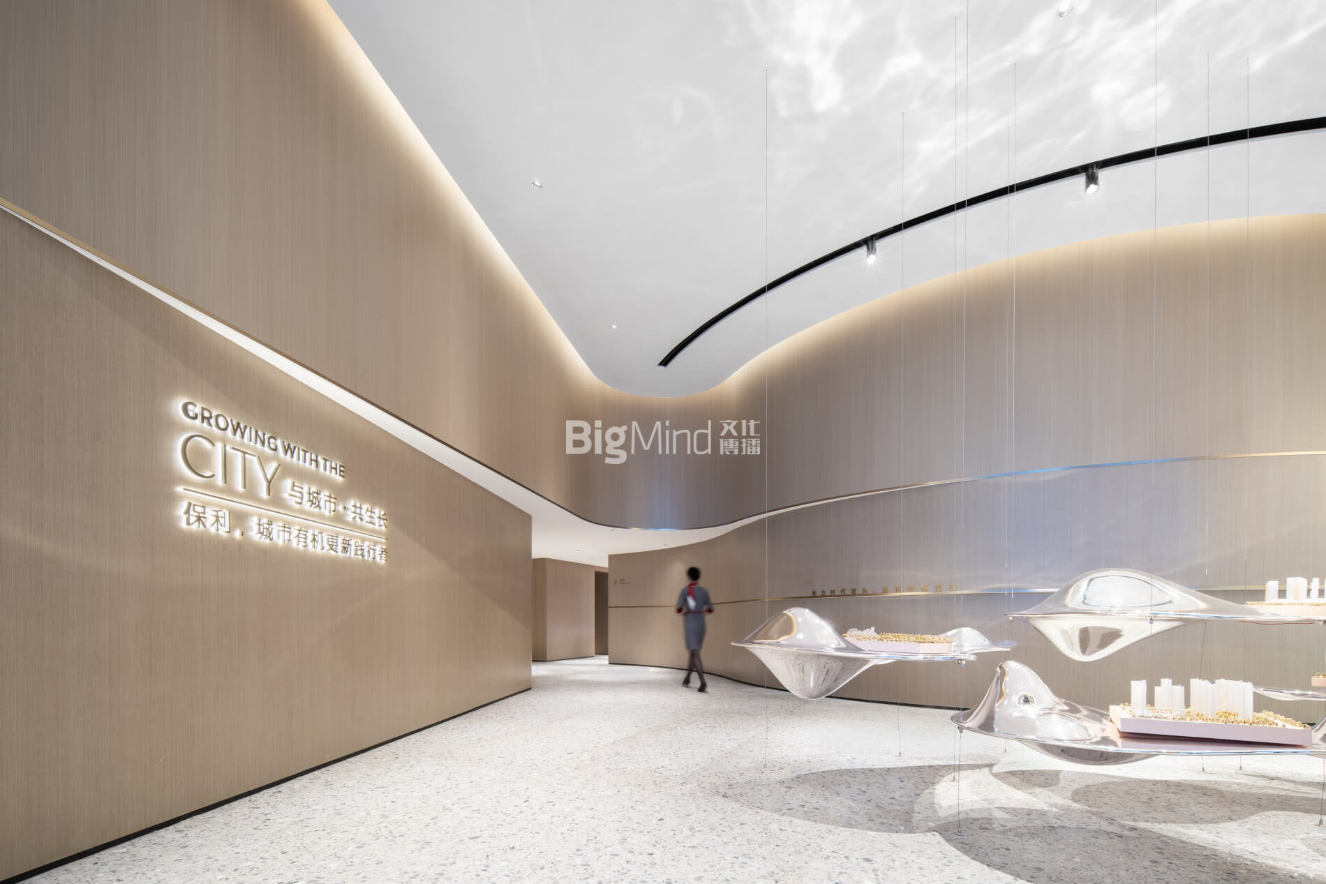 保利沙井城市发展展厅,静态展示空间、动态展示空间、交互展示空间层层演进,借助图文、实物、场景复原沙盘模型等配合灯光、材质、色彩的渲染,呈现的是深圳气质的一种,亦是千千万万人共同想象的一种。空间与人之间形成无形的场域,激发人新的知觉与行为发生。观者沉浸于空间之中,每一处的弧线设计、流畅的水波线条,都像漫步于时间的海滩,在这里,每一次呼吸,都伴随着时代浪潮的脉搏,跃动、流转。