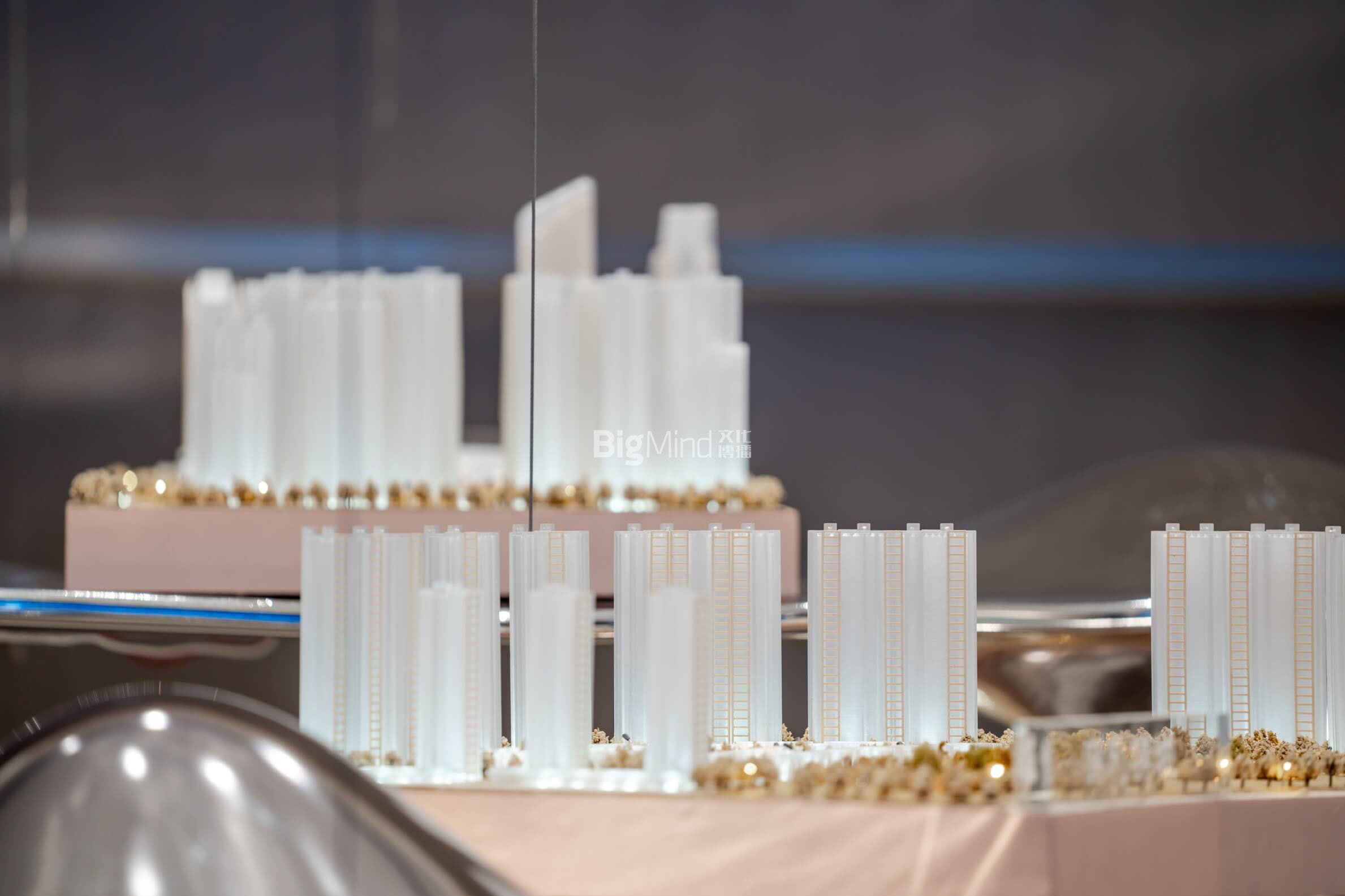 展厅由前厅、品牌长廊、影音室、城市更新区和项目展示区五大部分组成。品牌长廊衔接起前厅与空间腹地,中间只围合一个影音室作为缓冲。通过适度小空间的过渡,既能起到空间收缩的作用,又能加强室内交通空间序列的节奏感。自开阔的前厅迈入相对狭长的水平通道,经过相对小尺度空间的影音室,再进入宽敞的项目展示区时,豁然开朗的感受油然而生。