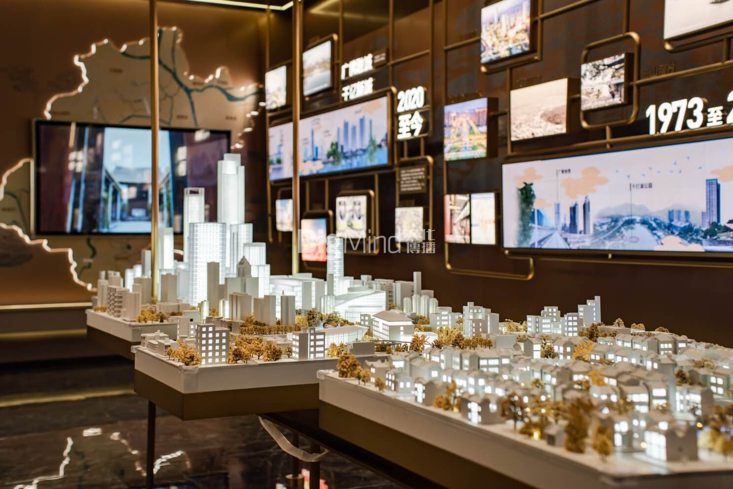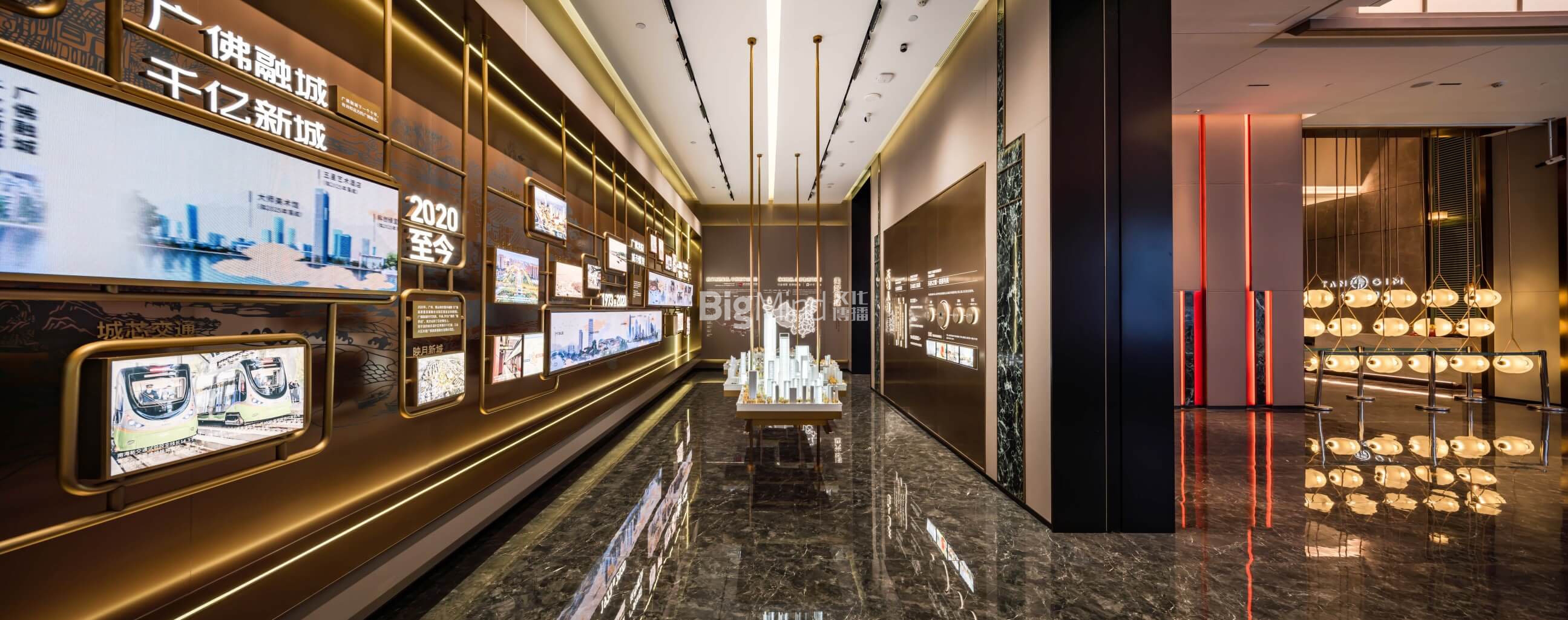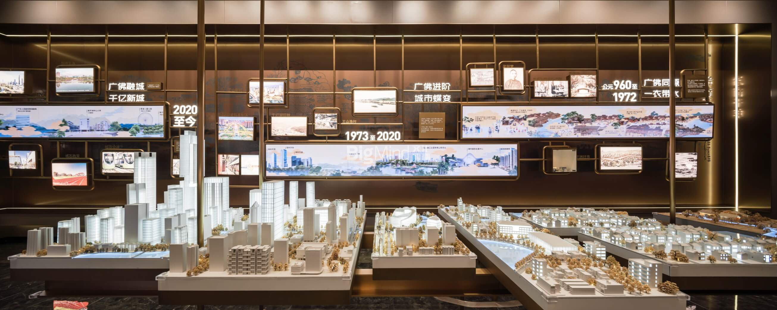 中央的空中吊装模型对应墙面自从至今的广佛同城的城市发展变迁,更加立体呈现岭南千年,广佛无界的展厅焦点。