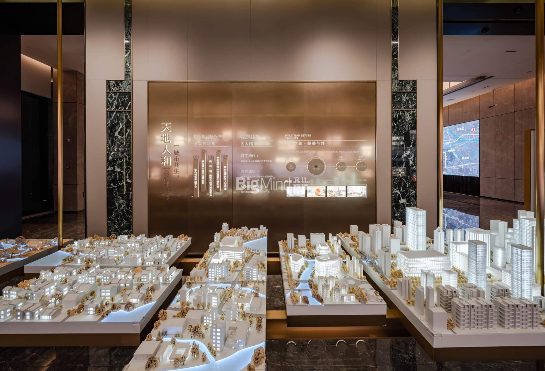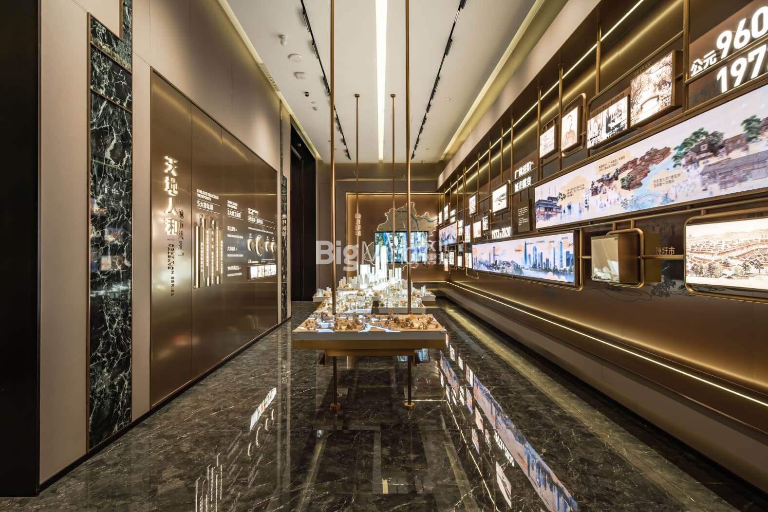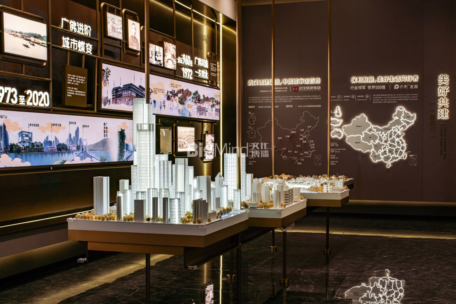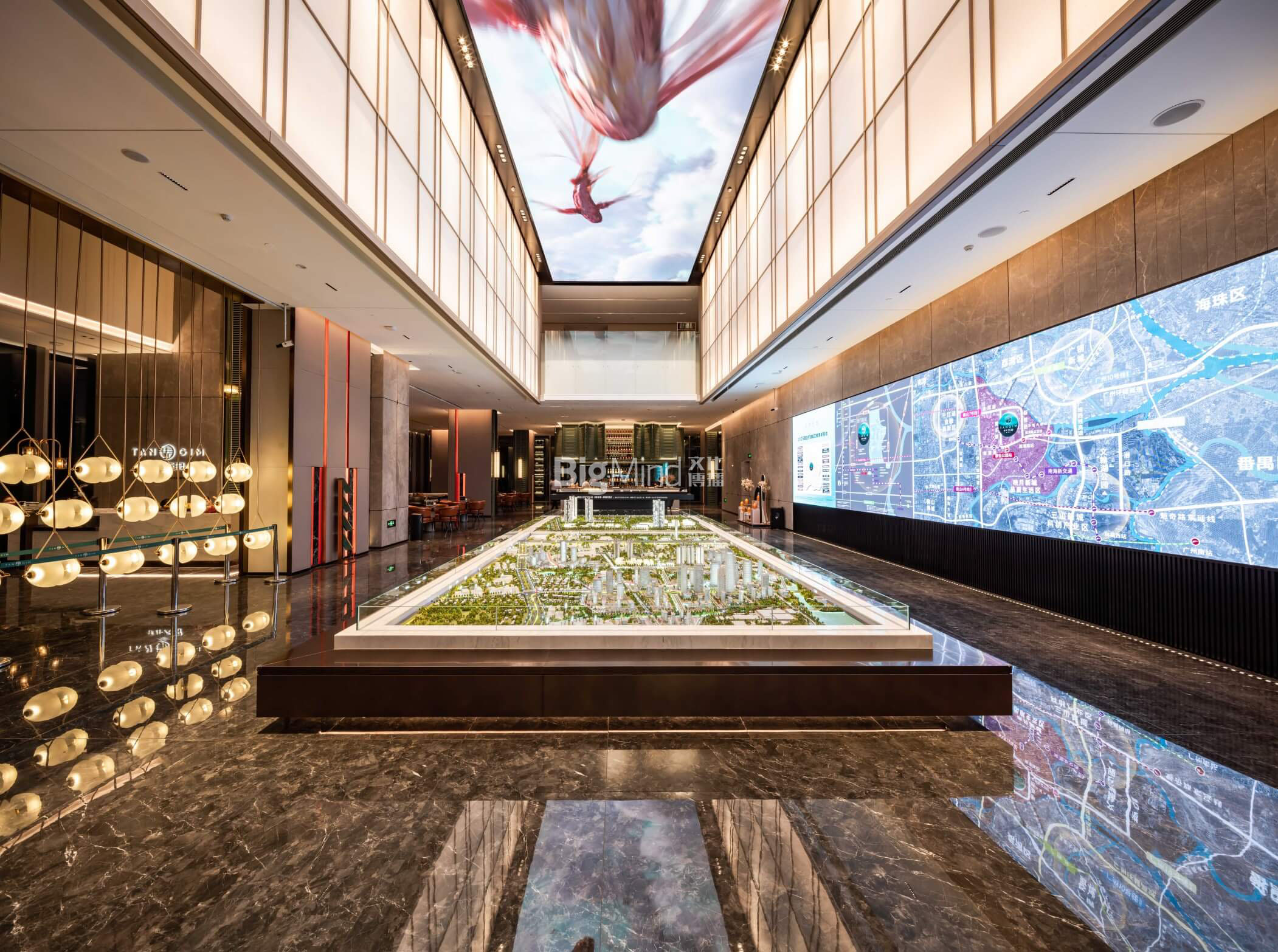 中央的空中吊装模型对应墙面自从至今的广佛同城的城市发展变迁,更加立体呈现岭南千年,广佛无界的展厅焦点。